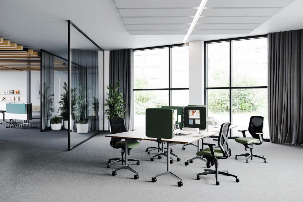 Wykorzystane w przestrzeniach dedykowanych hybrydowej współpracy elementy wyposażenia wnętrz i designu powinny poza mobilnością zapewniać odpowiednią akustykę. Dlatego w nowoczesnych przestrzeniach do pracy cyfralnej, w których rzadko wykorzystuje się sufity podwieszane, szczególnie ważny staje się wybór odpowiednich wykładzin o wysokiej izolacyjności i pochłanialności akustycznej. Amerykański producent wykładzin do wnętrz komercyjnych, firma Milliken w odpowiedzi na rosnące w obszarze akustyki potrzeby, już 20 lat temu opatentowała podłoże wykonane z pianki poliuretanowej tzw. podłoże Comfort Plus, które wykorzystywane jest w wykładzinach płytkowych producenta. Izolacyjność akustyczna wykładzin Milliken jest na poziomie – aż 36 db.!!! Pochłaniają one nawet do 50% więcej hałasów niż inne oferowane na rynku wykładziny na twardych podłożach. Wykorzystanie wykładzin Milliken pozwala nie tylko na stworzenie optymalnych akustycznie warunków do pracy, ale także na wykreowanie wrażenia mniejszych przestrzeni, bez stawiania dodatkowych ścian, (dzięki wielości wzorów) oraz co równie ważne, odpowiednie ich oznakowanie. W tym celu często wybierane są płytki z unikalnej, dedykowanej pracy biurowej w erze post COVID-kolekcji Social Factor.