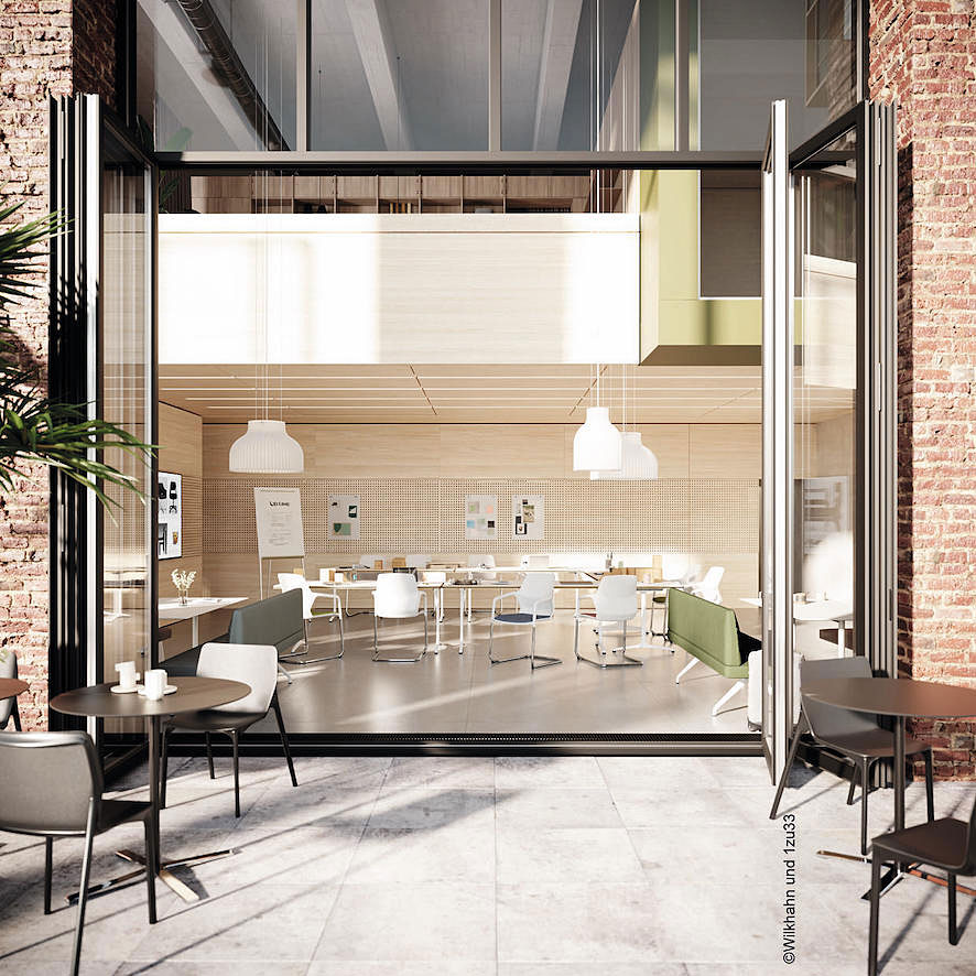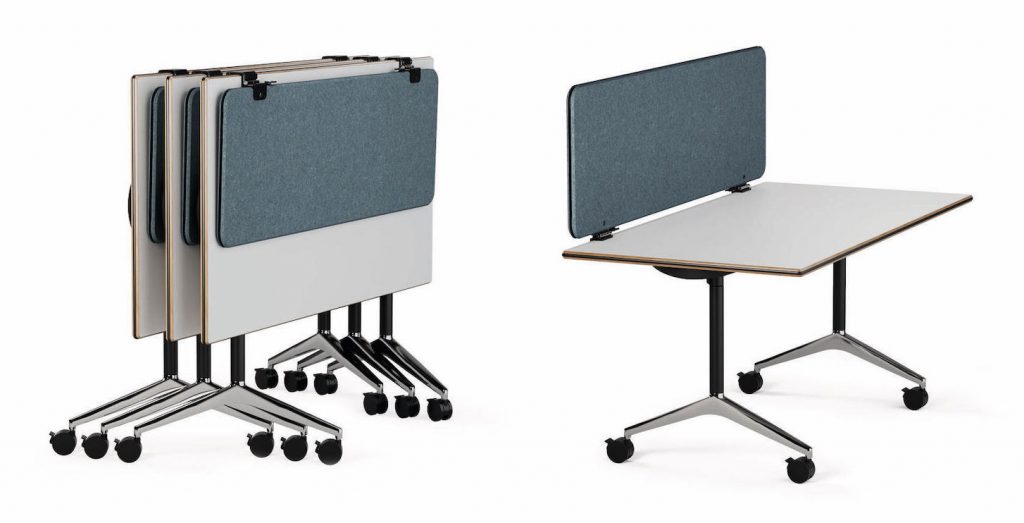 Do stworzenia odpowiednich warunków do pracy w erze pracy cyfralnej można wykorzystać kolekcję Timetable Wilkhahna. To mobilny system mebli, w którym znajdziemy stoły z odchylanym blatem oraz panele Foldscreen, umożliwiające przekształcenie wszystkich modeli z kolekcji Timetable w bardziej intymne, pojedyncze, osłonięte miejsca pracy. Panele są lekkie i łatwe w montażu, mogą być umieszczone na stole lub przymocowane za pomocą zacisków, bez żadnych dodatkowych narzędzi.