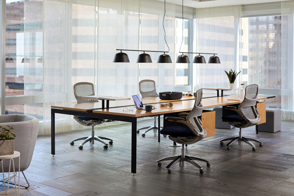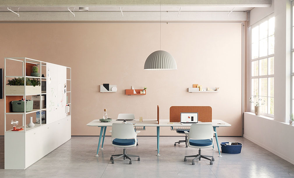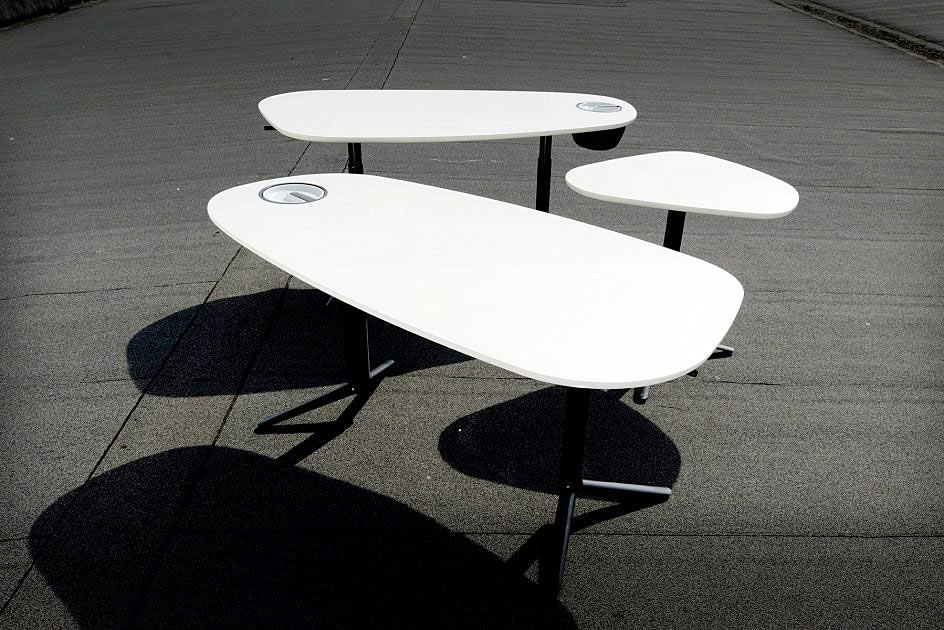 W nowo zaprojektowanych przestrzeniach do pracy dobrze sprawdzą się mniejsze gabarytowo, stoły trapezoidalne albo okrągłe, takie jak np. system modułowy stołów KEI od Bulo, MAX od Wilkhahna albo stoły firmy BLOG. Można przy nich łatwiej posadzić większą ilość uczestników przed kamerą, a także łatwiej nimi zarządzać. Stół Rockwell Unscripted® Sawhorse z Knolla pomaga dopasować pomieszczenie/przestrzeń do różnych potrzeb, jakie pojawiają się podczas współpracy cyfralnej (cyfrowej + realnej). Innym elastycznym meblem, ułatwiającym pracę hybrydową jest Scope Team Table od Knolla. To jeden mebel, przy którym ludzie mogą pracować jako zespół (w opcji stołu konferencyjnego) albo indywidualnie. Stół można w każdej chwili podzielić na odrębne hot deski wykorzystując do tego specjalnie zaprojektowane ekrany Universal.